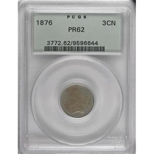 <B>1876 3CN PR62 PCGS.</B></I> PCGS Population (10/324). NGC Census: (12/259). Mintage: 1,150. Numismedia Wsl. Price for NGC/PCGS coin in PR62: $220. (#3772)<BR><BR><B>Coin Engraver:</B> James B. Longacre<BR><BR><b>Shipping:</b> Coins & Currency (<a target="_blank" href="http://www.heritageauctions.com/common/shipping.php">view shipping information</a>)