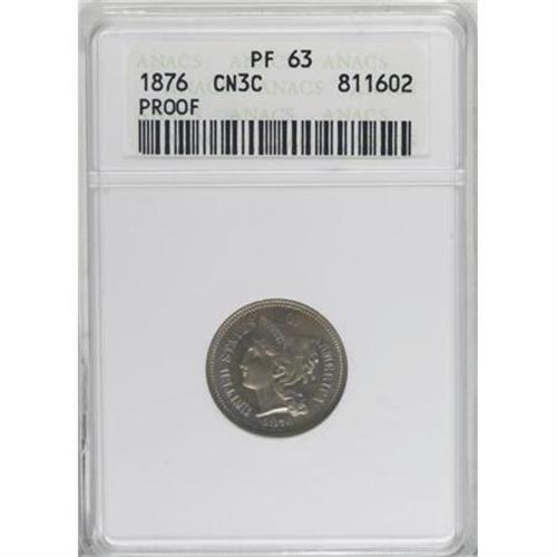 <B>1876 3CN PR63 ANACS.</B></I> NGC Census: (27/232). PCGS Population (66/258). Mintage: 1,150. Numismedia Wsl. Price for NGC/PCGS coin in PR63: $290. (#3772)<BR><BR><B>Coin Engraver:</B> James B. Longacre<BR><BR><b>Shipping:</b> Coins & Currency (<a target="_blank" href="http://www.heritageauctions.com/common/shipping.php">view shipping information</a>)