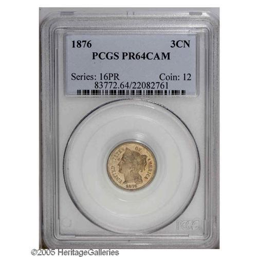 <B>1876<3CN> PR64 Cameo PCGS.</B></I> Milky reddish-tan coloration appears over the glassy, greenish fields. Well struck and free of handling marks or hairlines, the piece shows some faint striations (as struck) on the reverse.