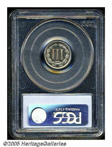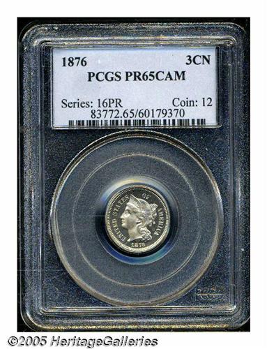 <B>1876<3CN> PR65 Cameo PCGS.</B></I> Lovely cameo example with light peach color. Gem eye appeal, a small area of missing frost is seen on Liberty's neck.