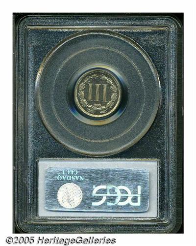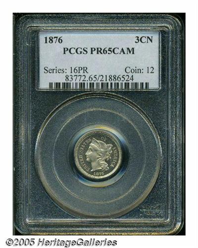 <B>1876<3CN> PR65 Cameo PCGS.</B></I> Obvious white on black contrast confirms the Cameo status of this meticulously struck and faintly toned Gem. A lovely souvenir of our nation's Centennial year. Population: 27 in 65 Cameo, 10 finer (5/05).