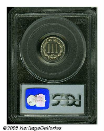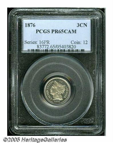 <B>1876<3CN> PR65 Cameo PCGS.</B></I> The contrast on this well mirrored Gem is especially pronounced on the obverse. A few trivial flecks of carbon blend harmlessly into blushes of light patina. Population: 26 in 65 Cameo, 10 finer (5/05).<BR><I>From The Western Hills Collection.</B></I>