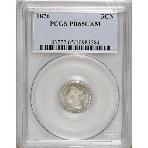 1876 3CN PR65 Cameo PCGS. The portrait and wreath are