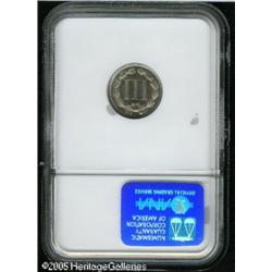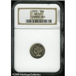 <B>1876 3CN PR65 NGC.</B></I> Faint speckles of olive color occupy bright, virtually blemish free surfaces on each side. All of the design elements are well struck<BR><I>From The Mike Jacobson Collection.</B></I> Lot:5739