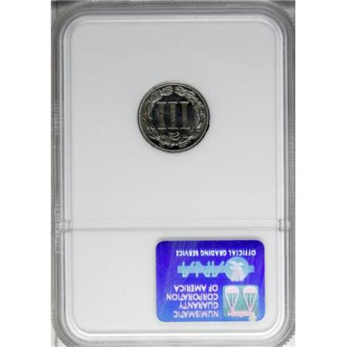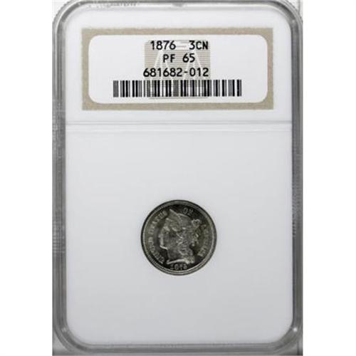 <B>1876 3CN PR65 NGC.</B></I> Nicely struck, with faint powder-blue patina. Peppery specks visit each side. Census: 96 in 65, 31 finer (1/08).<BR><I>From The Southwest Collection.</B></I><BR><BR><B>Coin Engraver:</B> James B. Longacre<BR><BR><b>Shipping:</b> Coins & Currency (<a target="_blank" href="http://www.heritageauctions.com/common/shipping.php">view shipping information</a>)