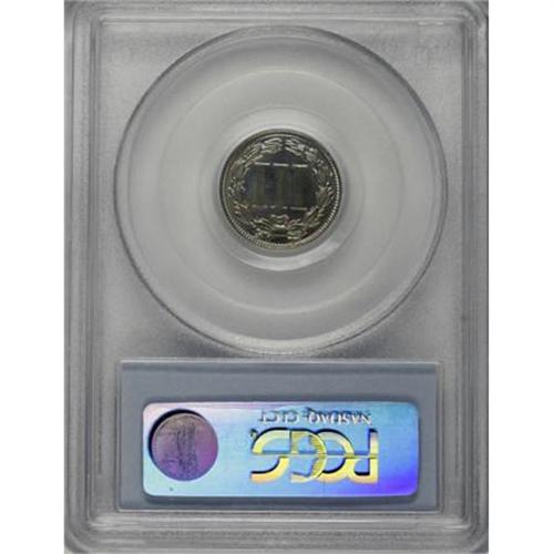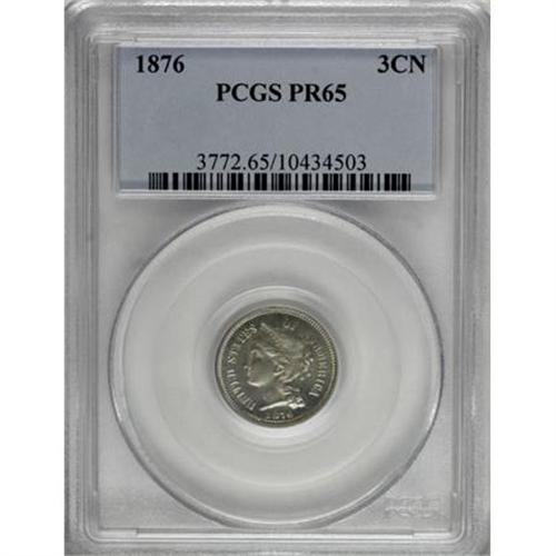 <B>1876 3CN PR65 PCGS.</B></I> Delicate hues of green, blue, gold, and violet adorn each side of this Gem proof, and as expected, the design elements are well brought up. A few light flecks are noted on both obverse and reverse. Population: 79 in 65, 11 finer (8/07).<BR><BR><B>Coin Engraver:</B> James B. Longacre<BR><BR><b>Shipping:</b> Coins & Currency (<a target="_blank" href="http://www.heritageauctions.com/common/shipping.php">view shipping information</a>)