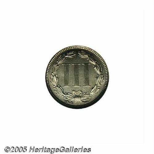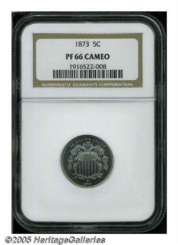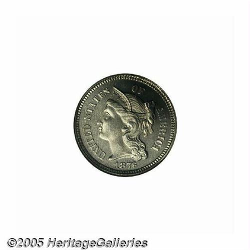 <B>1876<3CN> PR66 Cameo NGC.</B></I> Lightly toned and nicely mirrored, with contrast that places it solidly in the cameo category. A popular centennial year issue. Population: 9 in 66 Cameo, 2 finer (6/05).