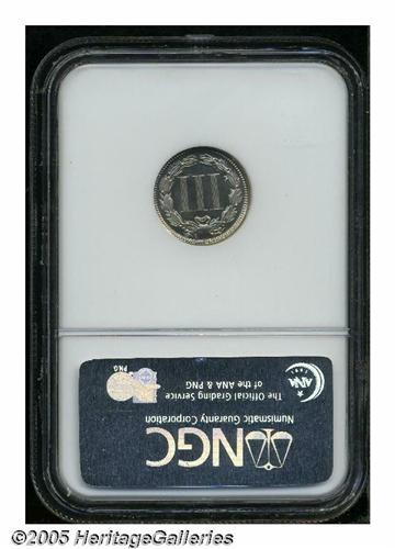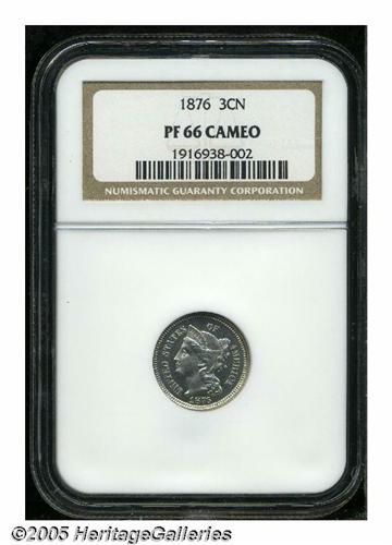 <B>1876<3CN> PR66 Cameo NGC.</B></I> Sharply struck, untoned, and nearly pristine, this attractive premium Gem proof displays rich reflectivity in the fields and suitably frosted devices. A small die lump (as struck) rests along the lower central edge of Liberty's bust, and a wispy planchet flaw (as made) is located just below the upper left leaves of the reverse wreath. A conditionally scarce and highly desirable coin at this lofty grade level, and with the Cameo designation from NGC. Population: 9 in 66 Cameo, 2 finer in Cameo (4/05).