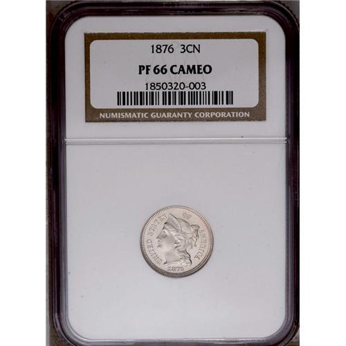 <B>1876<3CN> PR66 Cameo NGC.</B></I> The contrast on this untoned Gem is especially pronounced on the obverse. Razor sharp and void of noticeable carbon. Census: 8 in 66 Cameo, 2 finer (5/06).