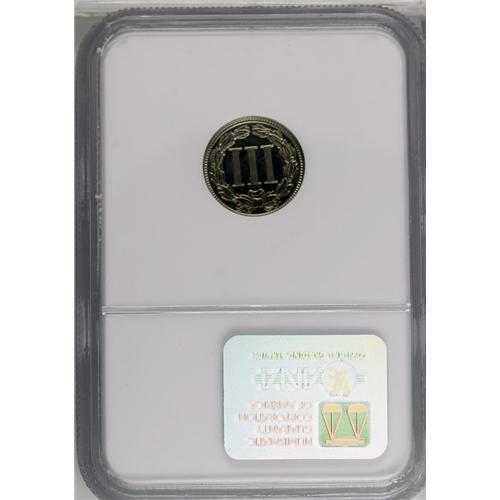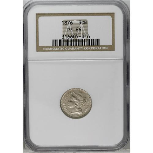 <B>1876<3CN> PR66 NGC.</B></I> Dazzling reflectivity is enhanced by delicate golden highlights. The front of the slab is noticeably scuffy, possibly dictating reholdering.