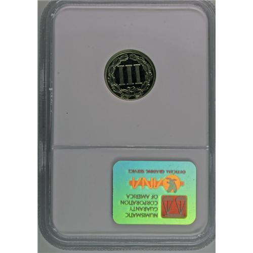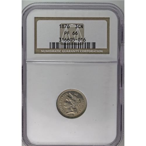<B>1876<3CN> PR66 NGC.</B></I> Dazzling reflectivity is enhanced by delicate golden highlights. The front of the slab is noticeably scuffy, possibly suggesting reholdering. Census: 30 in 66, 2 finer (8/06).