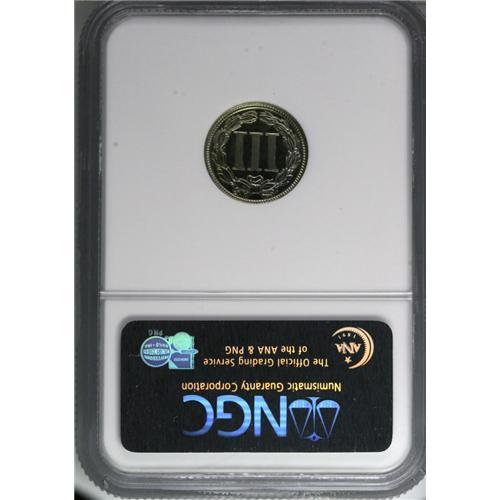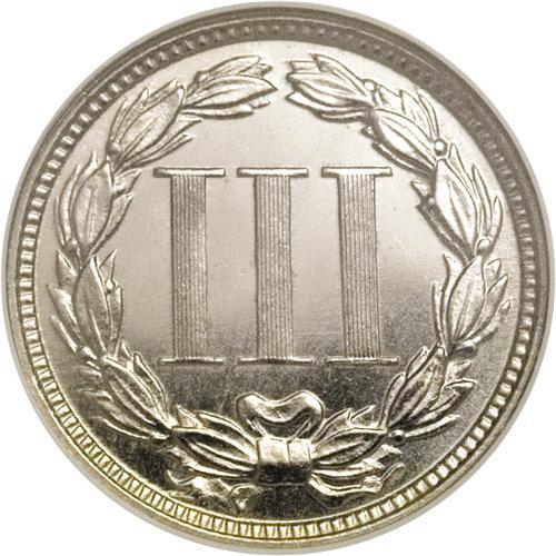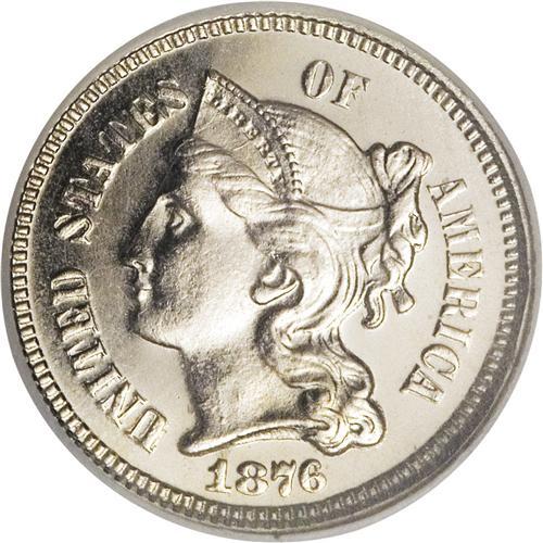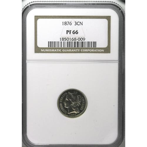 <B>1876<3CN> PR66 NGC.</B></I> Proof production rose once again in 1876, possibly in anticipation of increased demand from collectors because of the Centennial celebrations. This may have proved a prudent move on the part of Mint personnel as a significant portion of the original proof mintage still survives today. This is a brilliant coin that has no noticeable surface flaws on either side. There is a light overlay of mint frost on the devices, but not enough to warrant a Cameo designation.