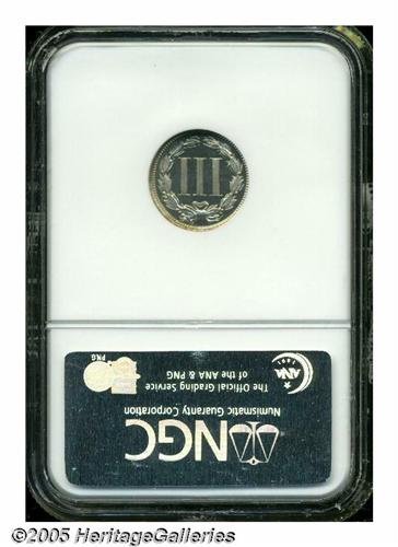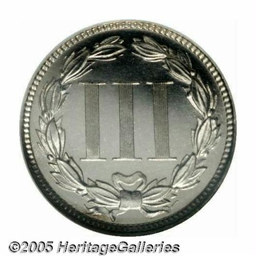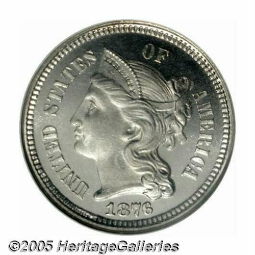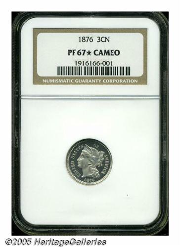 <B>1876<3CN> PR67 <S Cameo NGC.</B></I> Brilliant overall with exceptionally deep mirrors in the fields, the devices are very nicely frosted which provides a strong field-to-devices contrast on each side. A stunning coin and virtually unsurpassable in terms of aesthetic appeal.