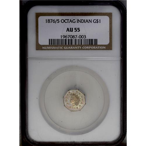 <B>1876/5<$1> Indian Octagonal 1 Dollar, BG-1129, R.4 AU55 NGC.</B></I> The NGC insert has inadvertently omitted the Breen-Gillio attribution. This lightly hairlined example is iridescently patinated in lilac, orange, and forest-green hues. <BR><BR><B>Important notice:</B> Heritage usually auctions material at the rate of 200-250 lots per hour. On some occasions eBay Live bid software or the Internet may not be able to keep up with the pace of the auction. We recommend placing a realistic absentee bid now as insurance to avoid disappointment. Occasionally the auctioneer may eliminate or reject an eBay Live bid, and the auctioneer may also reopen a lot after the close of the eBay live bidding (usually because we missed an audience bid), and may reject your bid even if it shows you as the winning bidder. By bidding via eBay Live, you agree that Heritage may award the lot to another bidder at its sole discretion under the circumstances described above or any other reasonable circumstances. Since eBay bids are not shown to us until we open the lot on the floor, we treat those bids just like floor bids. In most cases the floor responds before the eBay bid is presented to us, due to Internet lag time, so for consistency we have made it a policy that floor bids are always considered first over tie eBay live bids. Also please note that all Heritage lots purchased through eBay Live carry a 20% Buyer's Premium. Please make sure you read the Terms and Conditions before you bid. This lot is being auctioned in conjunction with a live floor auction by Heritage Galleries & Auctioneers. All final auction and invoice information will be supplied by Heritage Galleries & Auctioneers, and all other information should be considered preliminary. Lot:4805 <BR><BR><B>Winning Notification and Billing:</B> After the FINAL session in this auction is complete, Heritage will send e-mail and snail mail invoices. This process normally takes several days. All final auction and invoice information will be supplied by Heritage Galleries & Auctioneers, and all other information should be considered preliminary. <BR><BR>This auction will be conducted on a live auction floor and over the Internet through eBay Live. If you choose to place an absentee bid, please take a moment to <font color='#0000ff'><u><a href='http://pages.ebay.com/liveauctions/help/before/laabsentee.html'>learn how eBay Live absentee bidding works</a></u></font><font color='#000000'>