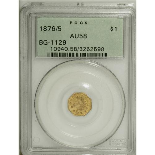 <B>1876/5 $1 Indian Octagonal 1 Dollar, BG-1129, R.4 AU58 PCGS.</B></I> Modestly reflective with minor friction on the highpoints. The lightly marked gold-orange surfaces exhibit a degree of haze and light handling marks. Population: 17 in 58, 58 finer (1/07).<BR><BR><b>Shipping:</b> Coins & Currency (<a target="_blank" href="http://www.heritageauctions.com/common/shipping.php">view shipping information</a>)