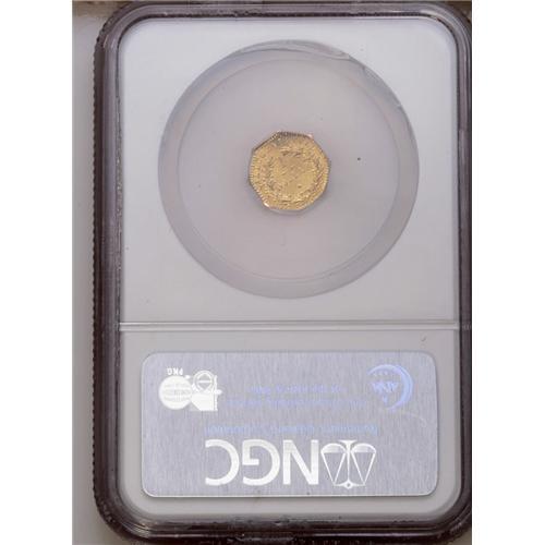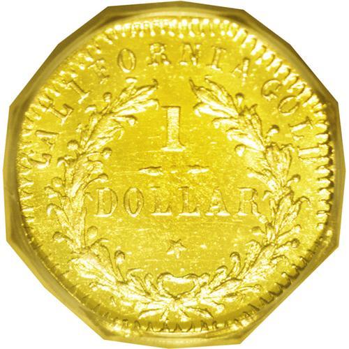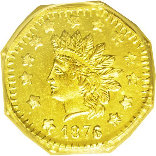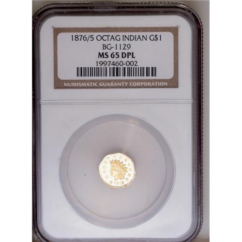 <B>1876/5<$1> Indian Octagonal 1 Dollar, BG-1129, R.4 MS65 Deep Mirror Prooflike NGC.</B></I> This issue was struck from the same dies as the BG-1127 and BG-1128 pieces, but modified by the maker. The obverse denticles are longer and the reverse wreath is heavier than on those varieties. The 6 in the date is crudely recut over a 5, as made. The profoundly deep mirrors on this tiny coin are completely pristine and free of even the smallest distractions, with frosty devices. The strike through LLA is a bit weak, but bold elsewhere. The highest graded of the issue, and the only NGC-certified Deep Mirror Prooflike example. Worthy of specialist attention!