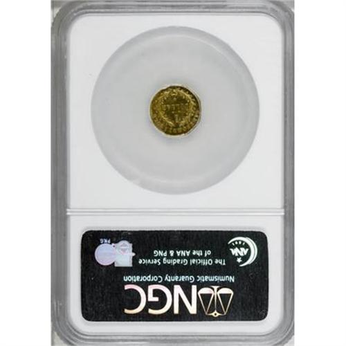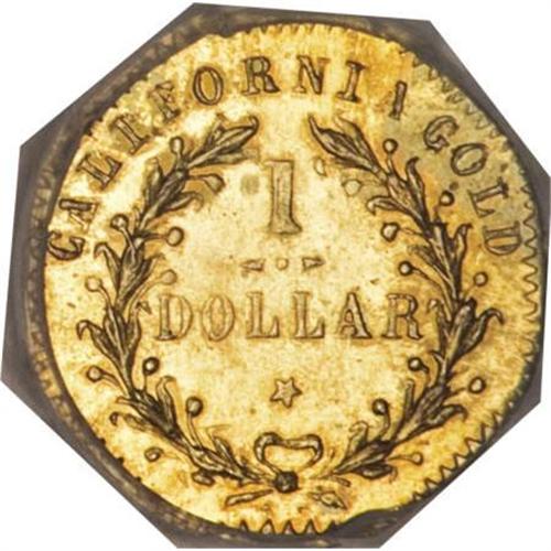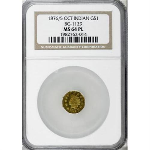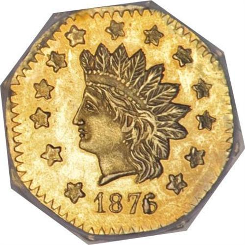 <B>1876/5 $1 Indian Octagonal 1 Dollar, BG-1129, R.4 MS64 Prooflike NGC.</B></I> Deep olive toning adorns the prooflike surfaces of this remarkably well preserved example, and hints of apricot and lilac are seen near the borders. The design elements are very well produced for this type; and struck with 180 degree rotation between obverse and reverse. Only the faintest of marks are evident, making this seem like a conservatively graded near-Gem. Census: 5 in 64, 2 finer (3/08). <BR><BR><b>Shipping:</b> Coins & Currency (<a target="_blank" href="http://www.heritageauctions.com/common/shipping.php">view shipping information</a>)