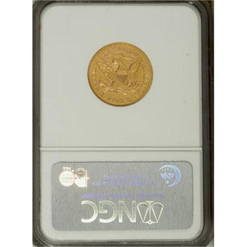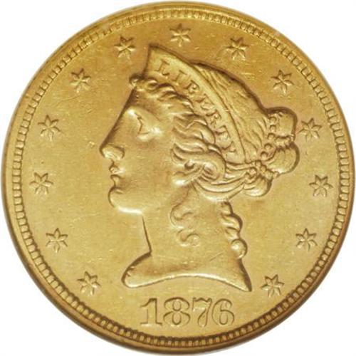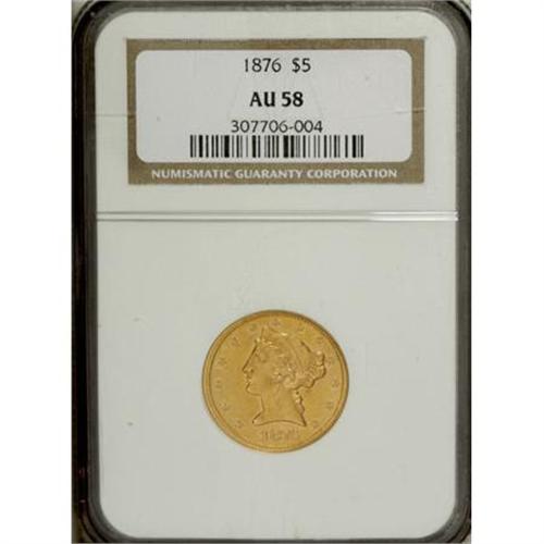 <B>1876 $5 AU58 NGC.</B></I> The rarity of the 1876 half eagle, with a mintage of only 1,432 business strikes plus 45 proofs, is overshadowed by the 1875 half eagle, one of the classic rarities in U.S. numismatics that was produced to the extent of only 200 circulation strikes plus 20 proofs. While the 1876 is rarely seen in any grade, according to Garrett and Guth, the authors reminds us that the date is one of the few With Motto early half eagles occasionally seen in Gem condition, perhaps owing to its status as a souvenir of the U.S. Centennial celebration.<BR> This coin offers semiprooflike reflectivity over the distraction-free yellow-gold surfaces, and a decent strike save for light softness on the eagle's neck and feathers. As an indication of the rarity of this issue, both NGC and PCGS combined have certified only nine pieces in AU58, exceeded by 13 coins at both services and including the inevitable duplications (6/07).<BR><BR><b>Shipping:</b> Coins & Currency (<a target="_blank" href="http://www.heritageauctions.com/common/shipping.php">view shipping information</a>)