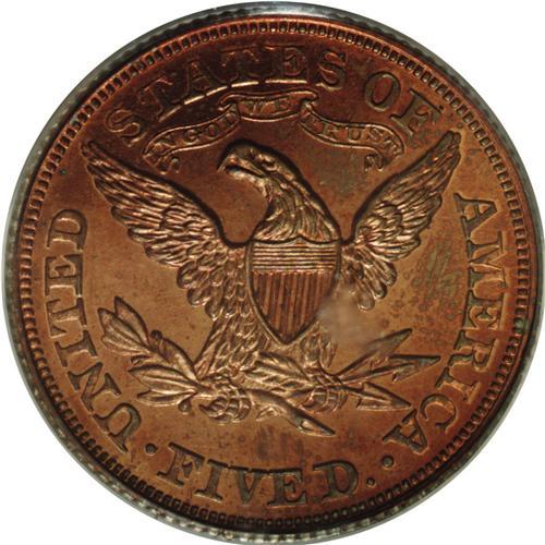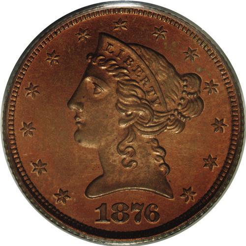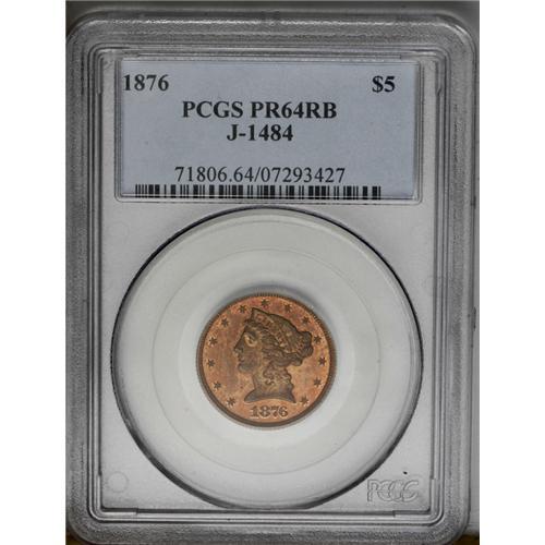 <B>1876<$5> Five Dollar, Judd-1484, Pollock-1637, R.7, PR64 Red and Brown PCGS.</B></I> Struck with regular issue half eagle dies, but in copper with a reeded edge. Such pieces are often referred to as die trials strikings, but Judd-1484 was more likely struck for sale to select dealers or collectors, as part of a denominational off-metal set. All of the 1876 silver and gold denomination coins were also struck in copper. The deep brick-red surfaces reveal pale blue and iridescent toning when rotated under a light. A well struck and carefully preserved specimen. This is the first time that we have handled this particular Judd variety since beginning our auction archives in 1993.