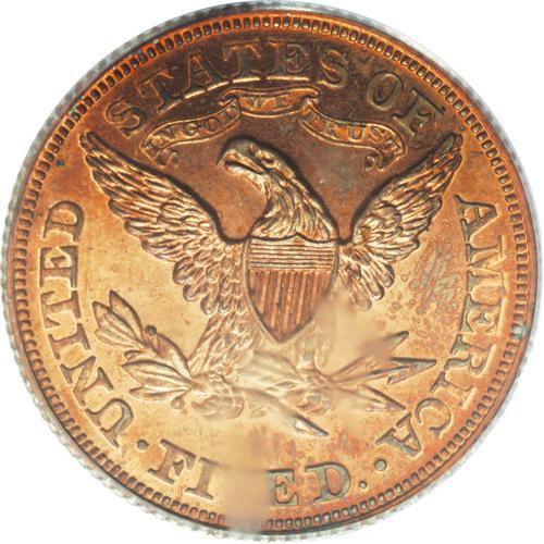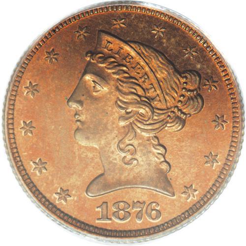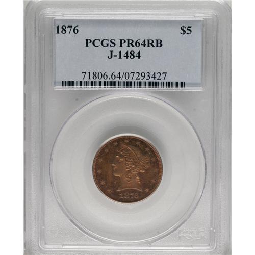 <B>1876 $5 Five Dollar, Judd-1484, Pollock-1637, R.7, PR64 Red and Brown PCGS.</B></I> Struck with regular issue half eagle dies, but in copper with a reeded edge. Such pieces are often referred to as die trials strikings, but Judd-1484 was more likely struck for sale to select dealers or collectors, as part of a denominational off-metal set. All of the 1876 silver and gold denomination coins were also struck in copper. The deep brick-red surfaces reveal pale blue and iridescent toning when rotated under a light. A well struck and carefully preserved specimen.<BR><BR><b>Shipping:</b> Coins & Currency (<a target="_blank" href="http://www.heritageauctions.com/common/shipping.php">view shipping information</a>)