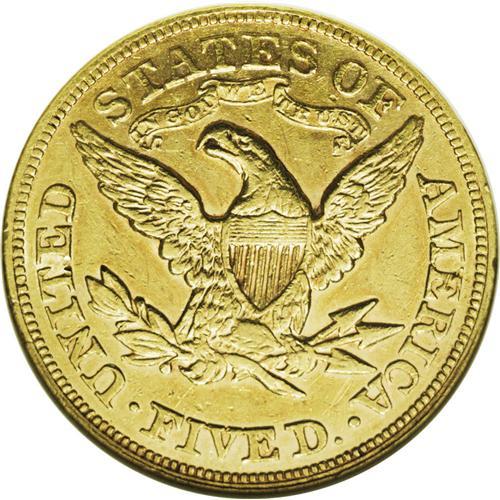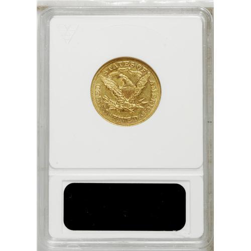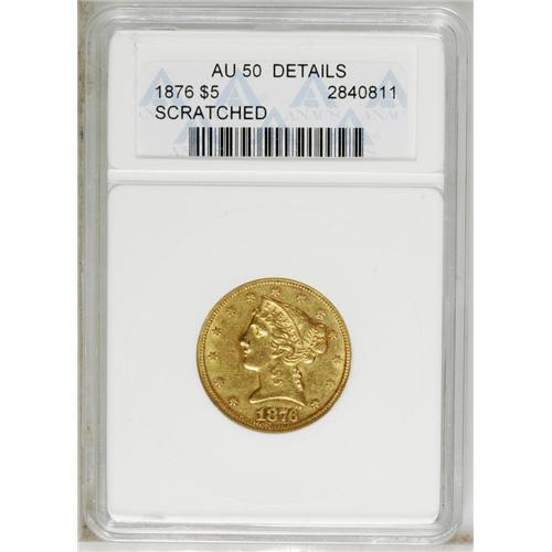 <B>1876<$5>--Scratched--ANACS. AU50 Details.</B></I> During the Civil War, Federal paper money replaced gold coins in circulation, except in the remote West. Gold coins rarely appeared again in commerce until 1878, when paper money finally traded at par with gold coinage. Low mintages were the rule for Philadelphia issues, and a scant 1,432 half eagles were struck in 1876. The present example has a few minor pinscratches in the reverse field near some of the lettering. Otherwise this is a well defined, reddish-golden example with an overall pleasing appearance.