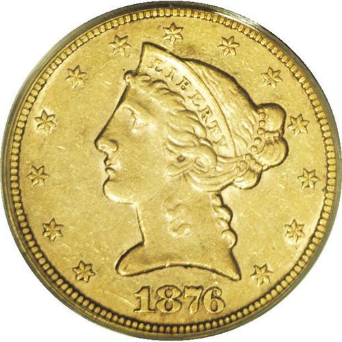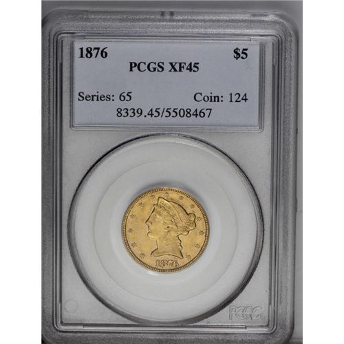 <B>1876 $5 XF45 PCGS.</B></I> In 1876, gold coins did not circulate except on the West Coast, which was covered by the San Francisco Mint. Most gold denominations had token business strike productions at Philadelphia, made primarily to prevent the proofs from becoming great contemporary rarities. Nonetheless, no commercial three dollar pieces were issued, and the mintage of half eagles was limited to 1,432 pieces. Most of these have long since been melted. This lightly worn apricot-gold example is free from relevant marks. The strike is good although portions of the curls and eagle are incomplete. Population: 4 in 45, 14 finer (9/06).<BR><I>From The Jones Beach Collection.</B></I><BR><BR><b>Shipping:</b> Coin/Currency (<a target="_blank" href="http://www.heritageauctions.com/common/shipping.php">view shipping information</a>)