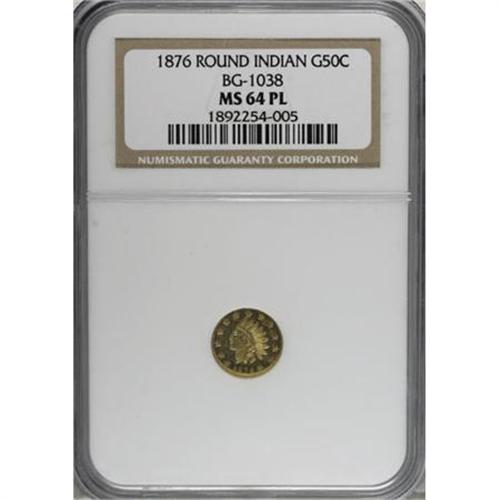 <B>1876 50C Indian Round 50 Cents, BG-1038, R.4, MS64 Prooflike NGC.</B></I> Mirrored fields and luminous devices attest to the Prooflike designation. The reverse of the NGC holder has a small flaw directly over the coin, which is unaffected and well preserved, aside from a wispy mark east of the fraction bar. Census: 1 in 64 Prooflike, 2 finer (9/07).<BR><BR><b>Shipping:</b> Coins & Currency (<a target="_blank" href="http://www.heritageauctions.com/common/shipping.php">view shipping information</a>)