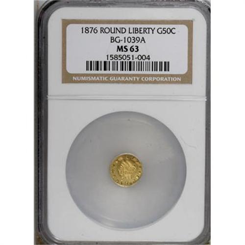 <B>1876 50C Liberty Round 50 Cents, High R.6, BG-1039A MS63 NGC.</B></I> This medal turn California small denomination gold piece is softly struck on the denominator and the A in DOLLAR, but the flashy fields are carefully preserved. Presently the only example of BG-1039A certified by NGC (7/07).<BR><BR><b>Shipping:</b> Coins & Currency (<a target="_blank" href="http://www.heritageauctions.com/common/shipping.php">view shipping information</a>)