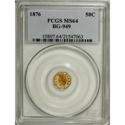 <B>1876 50C Indian Octagonal 50 Cents, BG-949, R.4, MS64 PCGS.</B></I> Similar in design to BG-950 and BG-951, but the date and upper stars are smaller. A few of the central reverse letters are indifferently struck, but the fields are flashy and the honey-gold toning is attractive. Population: 29 in 64, 5 finer (8/07).<BR><BR><b>Shipping:</b> Coins & Currency (<a target="_blank" href="http://www.heritageauctions.com/common/shipping.php">view shipping information</a>)