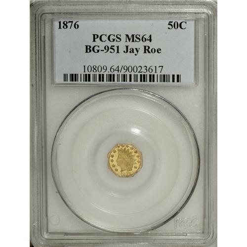 <B>1876 50C Indian Octagonal 50 Cents, BG-951, High R.5, MS64 PCGS.</B></I> Ex: Jay Roe. A flashy green-gold Choice California small denomination gold piece that has sharply struck devices. Only the 2 in the fraction is lightly brought up. The dies are moderately rotated. The plate coin for the variety in the second edition of Breen-Gillio.<BR><I>Ex: Jay Roe Collection (Bowers and Merena, 9/03), lot 434.</B></I><BR><BR><b>Shipping:</b> Coins & Currency (<a target="_blank" href="http://www.heritageauctions.com/common/shipping.php">view shipping information</a>)