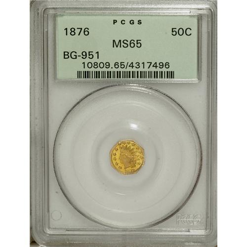 <B>1876 50C Indian Octagonal 50 Cents, BG-951, High R.5, MS65 PCGS.</B></I> The brightly mirrored yellow-gold fields and the luminous, boldly defined devices ensure the eye appeal. The central reverse has salmon-pink patina. Housed in a green label holder. Population: 6 in 65, 0 finer (3/07).<BR><BR><b>Shipping:</b> Coins & Currency (<a target="_blank" href="http://www.heritageauctions.com/common/shipping.php">view shipping information</a>)
