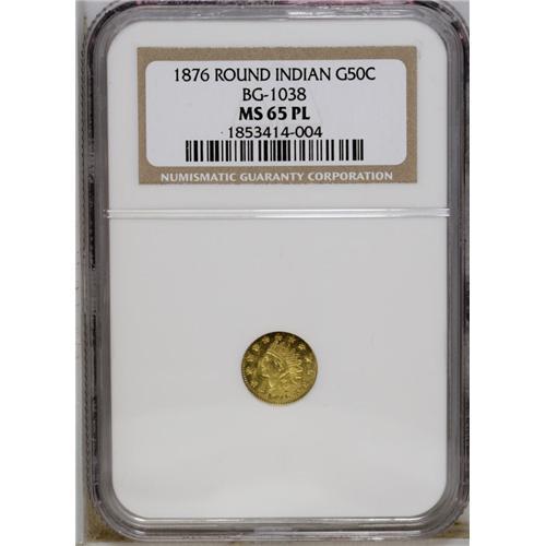 <B>1876 50C Indian Round 50 Cents, BG-1038, R.4, MS65 Prooflike NGC.</B></I> This evenly struck yellow-gold Gem has flashy fields that display faint clash marks. Mildly wavy, as produced. Census: 2 in 65 Prooflike, 0 finer (12/06).<BR><BR><b>Shipping:</b> Coins & Currency (<a target="_blank" href="http://www.heritageauctions.com/common/shipping.php">view shipping information</a>)