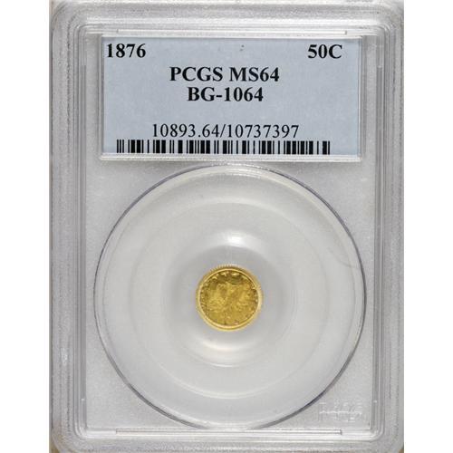 <B>1876 50C Indian Round 50 Cents, BG-1064, R.6, MS64 PCGS.</B></I> The first example of this issue offered by Heritage since the January 1996 FUN Sale, a testament to how elusive BG-1064 can be. Well struck with slightly diffuse reflectivity from hazy yellow-orange surfaces.<BR><BR><b>Shipping:</b> Coins & Currency (<a target="_blank" href="http://www.heritageauctions.com/common/shipping.php">view shipping information</a>)