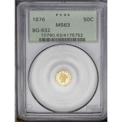 <B>1876<50C> Liberty Octagonal 50 Cents, BG-932, High R.4, MS63 PCGS.</B></I> Crisply struck save for left portions of the wreath. The strongly reflective fields show a few faint hairlines. In a green label holder. Population: 16 in 63, 11 finer (4/06).