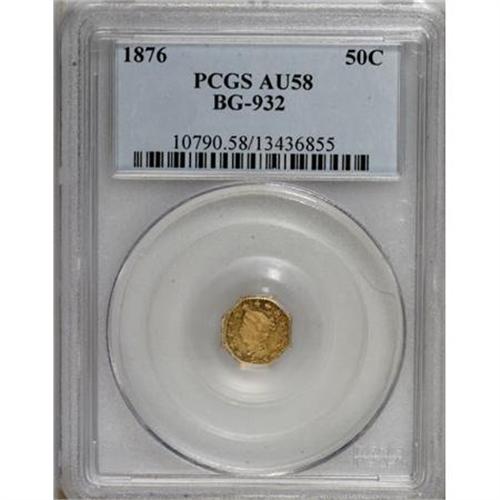 <B>1876 50C Liberty Octagonal 50 Cents, BG-932, High R.4, AU58 PCGS.</B></I> PCGS Population (5/39). NGC Census: (2/2). (#10790)<BR><BR><b>Shipping:</b> Coins & Currency (<a target="_blank" href="http://www.heritageauctions.com/common/shipping.php">view shipping information</a>)