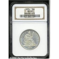 <B>1876<50C> MS65 NGC.</B></I> Tail Hub Variety One. WB-101. This is a plentiful variety for the 1876 Seated Half, of which 8.4 million pieces were produced, but Gems, nonetheless, are elusive. A truly lovely representative, both sides are overlaid in rich mint frost that thins to modest brightness in the fields. A nicely struck piece with a hint of apricot color and a few faint mint-made roller marks on each side. NGC reports 16 1876 Seated Halves of all varieties in MS65, and there are just four pieces finer (7/04). <BR><BR><B>Important notice:</B> Heritage usually auctions material at the rate of 200-250 lots per hour. On some occasions eBay Live bid software or the Internet may not be able to keep up with the pace of the auction. We recommend placing a realistic absentee bid now as insurance to avoid disappointment. Occasionally the auctioneer may eliminate or reject an eBay Live bid, and the auctioneer may also reopen a lot after the close of the eBay live bidding (usually because we missed an audience bid), and may reject your bid even if it shows you as the winning bidder. By bidding via eBay Live, you agree that Heritage may award the lot to another bidder at its sole discretion under the circumstances described above or any other reasonable circumstances. Since eBay bids are not shown to us until we open the lot on the floor, we treat those bids just like floor bids. In most cases the floor responds before the eBay bid is presented to us, due to Internet lag time, so for consistency we have made it a policy that floor bids are always considered first over tie eBay live bids. Also please note that all Heritage lots purchased through eBay Live carry a 20% Buyer's Premium. Please make sure you read the Terms and Conditions before you bid. </span></font></tr></table></td></tr></table>