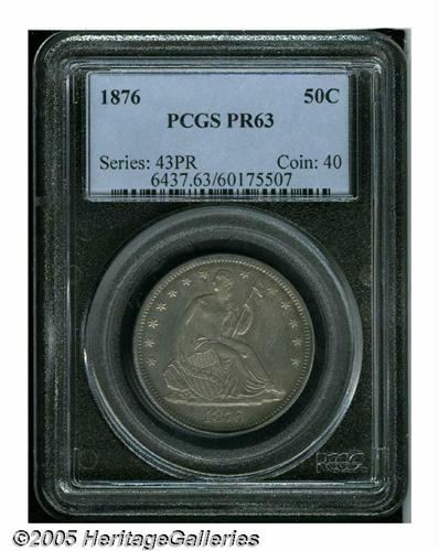 <B>1876<50C> PR63 PCGS.</B></I> Proof surfaces display light gray patination, and the design elements are exquisitely struck. A few wispy hairlines are not at all offensive.