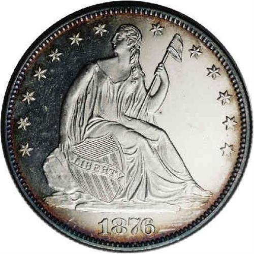 <B>1876<50C> PR64 Cameo NGC.</B></I> Type One Reverse. Tawny-gold and rose-red colors enrich the peripheries of this lovely Near Gem. Examples of this issue were sold by the U.S. Mint on the grounds of the Centennial Exposition held in Philadelphia in 1876. Liberty has only partial drapery beneath her elbow, as made. Tiny spots on the D in DOL and near the elbow prevent a finer grade. Population: 4 in 64 Cameo, 11 finer (8/05).