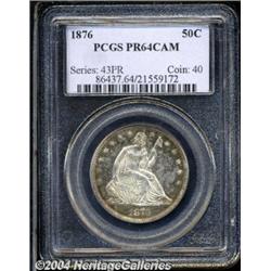 <B>1876<50C> PR64 Cameo PCGS.</B></I> Type One Reverse. Gorgeously toned in peripheral freckles of golden-brown and sea-green patina that surround the brilliant centers. A nicely struck and carefully preserved representative of this Centennial proof issue. Population: 4 in 64 Cameo, 3 finer (3/04). <BR><BR><B>Important notice:</B> Heritage usually auctions material at the rate of 200-250 lots per hour. On some occasions eBay Live bid software or the Internet may not be able to keep up with the pace of the auction. We recommend placing a realistic absentee bid now as insurance to avoid disappointment. Occasionally the auctioneer may eliminate or reject an eBay Live bid, and the auctioneer may also reopen a lot after the close of the eBay live bidding (usually because we missed an audience bid), and may reject your bid even if it shows you as the winning bidder. By bidding via eBay Live, you agree that Heritage may award the lot to another bidder at its sole discretion under the circumstances described above or any other reasonable circumstances. Since eBay bids are not shown to us until we open the lot on the floor, we treat those bids just like floor bids. In most cases the floor responds before the eBay bid is presented to us, due to Internet lag time, so for consistency we have made it a policy that floor bids are always considered first over tie eBay live bids. Also please note that all Heritage lots purchased through eBay Live carry a 20% Buyer's Premium. Please make sure you read the Terms and Conditions before you bid.