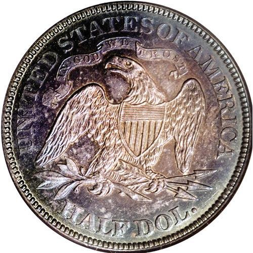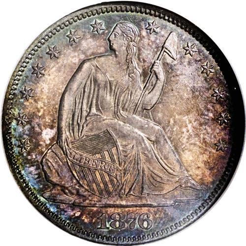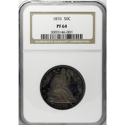 <B>1876 50C PR64 NGC.</B></I> Type One Reverse. Rings of ice-blue encircle pink-gray centers on both sides, with considerable luster emanating from beneath. A well-struck piece save for the eagle's right (facing) claw, and with much eye appeal. A nice near-Gem from the original proof mintage of 1,150 pieces. Census: 46 in 64, 26 finer (12/06).<BR><BR><b>Shipping:</b> Coin/Currency (<a target="_blank" href="http://www.heritageauctions.com/common/shipping.php">view shipping information</a>)