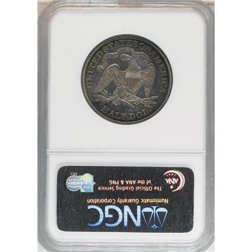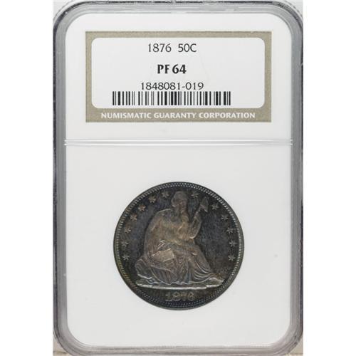 <B>1876 50C PR64 NGC.</B></I> Type One Reverse. The obverse is dramatically toned, with a golden center that gives way to russet and electric cyan near the rims. Several light hairlines in the right obverse field preclude Gem status.<BR><BR><b>Shipping:</b> Coins & Currency (<a target="_blank" href="http://www.heritageauctions.com/common/shipping.php">view shipping information</a>)