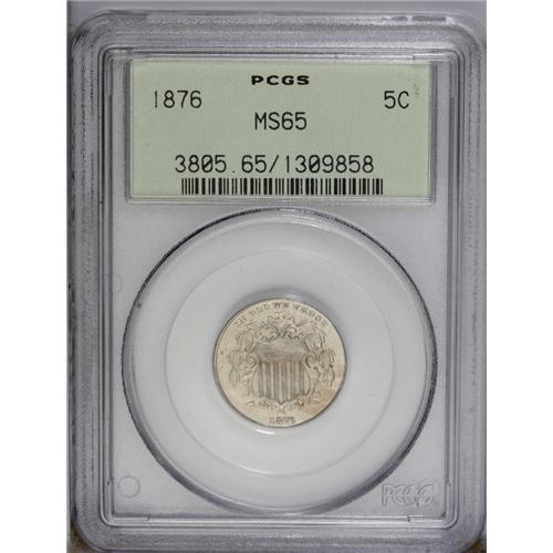 <B>1876<5C> MS65 PCGS.</B></I> Lustrous and consistently struck on the design elements, with light green-gray and pastel apricot-tan patina noticed on both sides. Wispy die striations (on the reverse) and die cracks (on the obverse) are observed, and there are a few scattered flyspecks on each side, but the piece seems to be essentially free of blemishes or abrasions. Population: 28 in 65, 6 finer (3/06). <BR><BR><B>Important notice:</B> Heritage usually auctions material at the rate of 200-250 lots per hour. On some occasions eBay Live bid software or the Internet may not be able to keep up with the pace of the auction. We recommend placing a realistic absentee bid now as insurance to avoid disappointment. Occasionally the auctioneer may eliminate or reject an eBay Live bid, and the auctioneer may also reopen a lot after the close of the eBay live bidding (usually because we missed an audience bid), and may reject your bid even if it shows you as the winning bidder. By bidding via eBay Live, you agree that Heritage may award the lot to another bidder at its sole discretion under the circumstances described above or any other reasonable circumstances. Since eBay bids are not shown to us until we open the lot on the floor, we treat those bids just like floor bids. In most cases the floor responds before the eBay bid is presented to us, due to Internet lag time, so for consistency we have made it a policy that floor bids are always considered first over tie eBay live bids. Also please note that all Heritage lots purchased through eBay Live carry a 20% Buyer's Premium. Please make sure you read the Terms and Conditions before you bid. This lot is being auctioned in conjunction with a live floor auction by Heritage Galleries & Auctioneers. All final auction and invoice information will be supplied by Heritage Galleries & Auctioneers, and all other information should be considered preliminary. Lot:860 <BR><BR><B>Winning Notification and Billing:</B> After the FINAL session in this auction is complete, Heritage will send e-mail and snail mail invoices. This process normally takes several days. All final auction and invoice information will be supplied by Heritage Galleries & Auctioneers, and all other information should be considered preliminary. <BR><BR>This auction will be conducted on a live auction floor and over the Internet through eBay Live. If you choose to place an absentee bid, please take a moment to <font color='#0000ff'><u><a href='http://pages.ebay.com/liveauctions/help/before/laabsentee.html'>learn how eBay Live absentee bidding works</a></u></font><font color='#000000'>