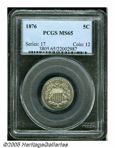 <B>1876<5C> MS65 PCGS.</B></I> Satiny-luster covers the surfaces of this Gem example. A few very small, largely peripheral, contact marks account for the grade.