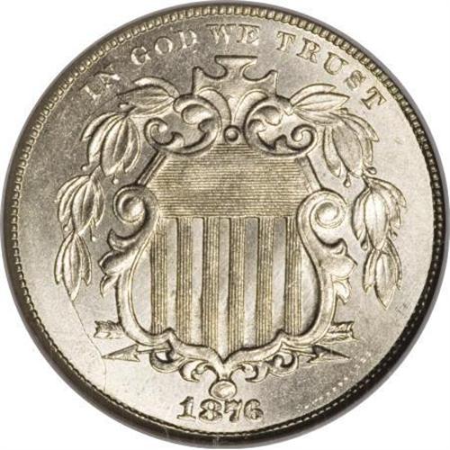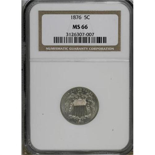 <B>1876 5C MS66 NGC.</B></I> An extremely important opportunity is presented to the specialist to obtain the finest certified 1876 Shield nickel. Every element of the design on the obverse and the reverse is sharp and complete. The surfaces have soft, frosty light gray luster, and they are entirely free of imperfections. Census: 5 in 66, 0 finer (1/08).<BR><BR><B>Coin Engraver:</B> James B. Longacre<BR><BR><b>Shipping:</b> Coins & Currency (<a target="_blank" href="http://www.heritageauctions.com/common/shipping.php">view shipping information</a>)