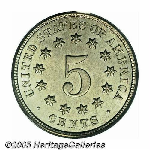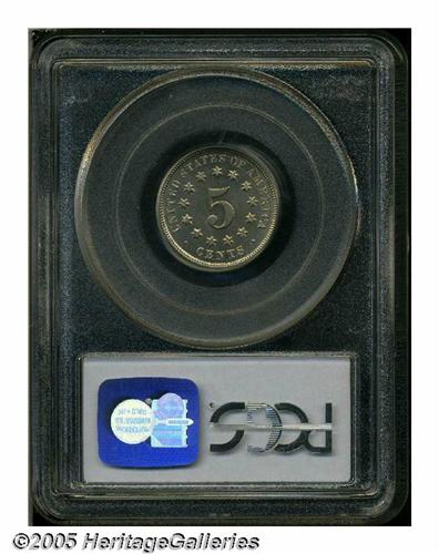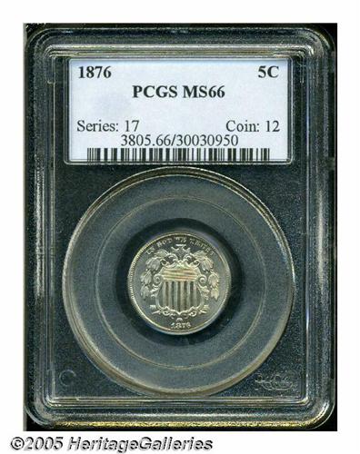 <B>1876<5C> MS66 PCGS.</B></I> Very difficult to find in the Mint State grades, especially in Premium Gem, the grade of the specimen in this lot. As of May 2005, PCGS and NGC combined have certified twelve pieces at this grade level, and none finer. Moreover, our auction records indicate that only ten MS66 examples have made appearances through the major houses over the past twelve or so years, and none graded higher. This piece has bright, lustrous surfaces visited by touches of light tan-gold patina. The design elements are sharply struck, and there are no mentionable marks. Population: 6 in 66, 0 finer (5/05).<BR><I>From The Western Hills Collection.</B></I>