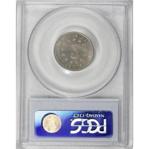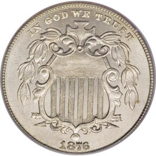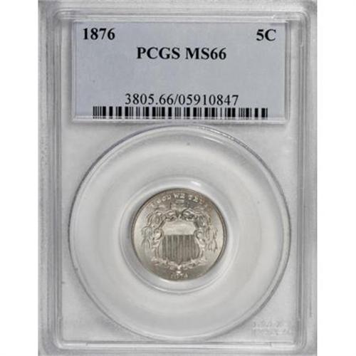 <B>1876 5C MS66 PCGS.</B></I> David Bowers (2006) writes that "A properly graded MS65 or finer coin, if well struck and with good eye appeal, is a rare find indeed." This description fits the bill for this Premium Gem. Its essentially untoned surfaces exhibit sharply struck devices, that on the obverse, stand out against prooflike fields. The reverse fields exhibit heavy die polish lines, and both sides are devoid of mentionable abrasions. Great overall eye appeal! Population: 8 in 66, 0 finer (8/07).<BR><BR><B>Coin Engraver:</B> James B. Longacre<BR><BR><b>Shipping:</b> Coins & Currency (<a target="_blank" href="http://www.heritageauctions.com/common/shipping.php">view shipping information</a>)