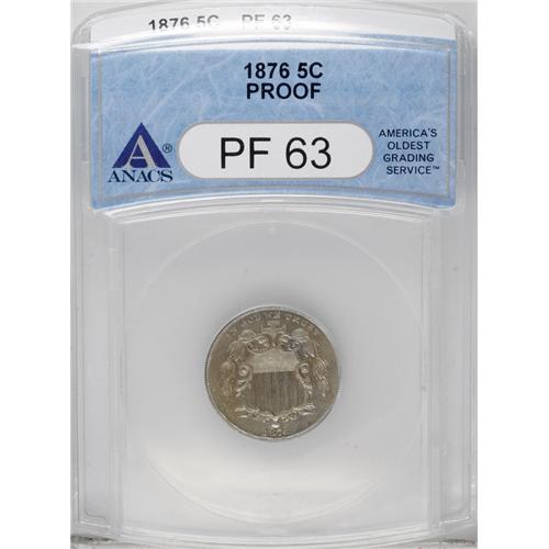 <B>1876 5C PR63 ANACS.</B></I> NGC Census: (27/211). PCGS Population (65/0). Mintage: 1,150. Numismedia Wsl. Price for NGC/PCGS coin in PR63: $258. (#3830)<BR><BR><b>Shipping:</b> Coins & Currency (<a target="_blank" href="http://www.heritageauctions.com/common/shipping.php">view shipping information</a>)