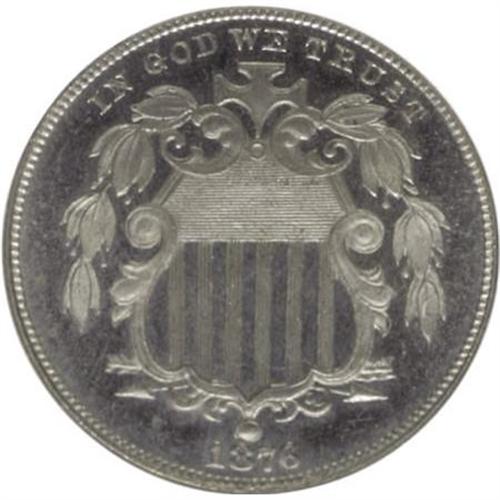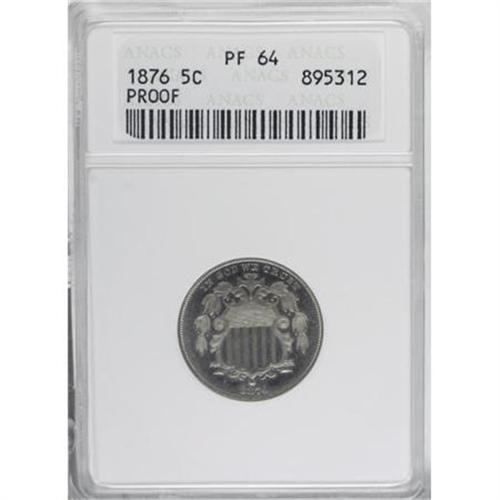 <B>1876 5C PR64 ANACS.</B></I> NGC Census: (96/116). PCGS Population (143/107). Mintage: 1,150. Numismedia Wsl. Price for NGC/PCGS coin in PR64: $420. (#3830)<BR><BR><B>Coin Engraver:</B> James B. Longacre<BR><BR><b>Shipping:</b> Coins & Currency (<a target="_blank" href="http://www.heritageauctions.com/common/shipping.php">view shipping information</a>)