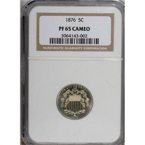 <B>1876 5C PR65 Cameo NGC.</B></I> A gleaming, predominantly nickel-gray Cameo Gem from the centennial year, decisively struck with distinct contrast. A handful of tiny toning spots are present at the obverse margins. Census: 14 in 65 Cameo, 26 finer (8/07).<BR><BR><b>Shipping:</b> Coins & Currency (<a target="_blank" href="http://www.heritageauctions.com/common/shipping.php">view shipping information</a>)