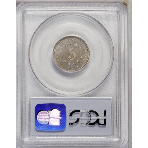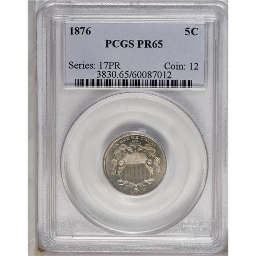 <B>1876<5C> PR65 PCGS.</B></I> A moderately mirrored Gem with lovely mint-green and gold toning on each side. A well-preserved and highly appealing piece from a mintage of 1,150 proofs.